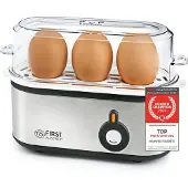 De First elektrische eierkoker is een compacte en praktische oplossing voor het koken van maximaal drie eieren tegelijk. Het apparaat is eenvoudig te bedienen en de maatbeker met geïntegreerde eierprikker maakt het gebruik extra makkelijk. Het automatische waarschuwingssignaal zorgt ervoor dat je eieren niet te lang koken. Het compacte formaat is ideaal voor kleine huishoudens of op vakantie. Let op: het apparaat is niet geschikt voor meer dan drie eieren en bij het gebruik van de maximale hoeveelheid water kan het sneller aanbranden. Ook is het waterreservoir niet afneembaar, wat het schoonmaken iets lastiger maakt.